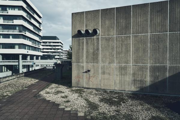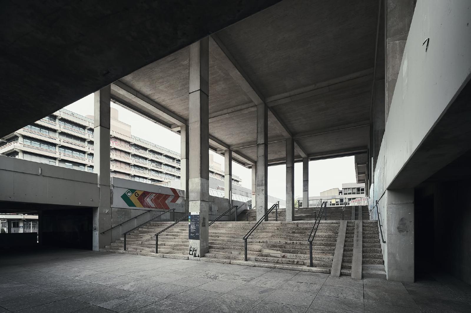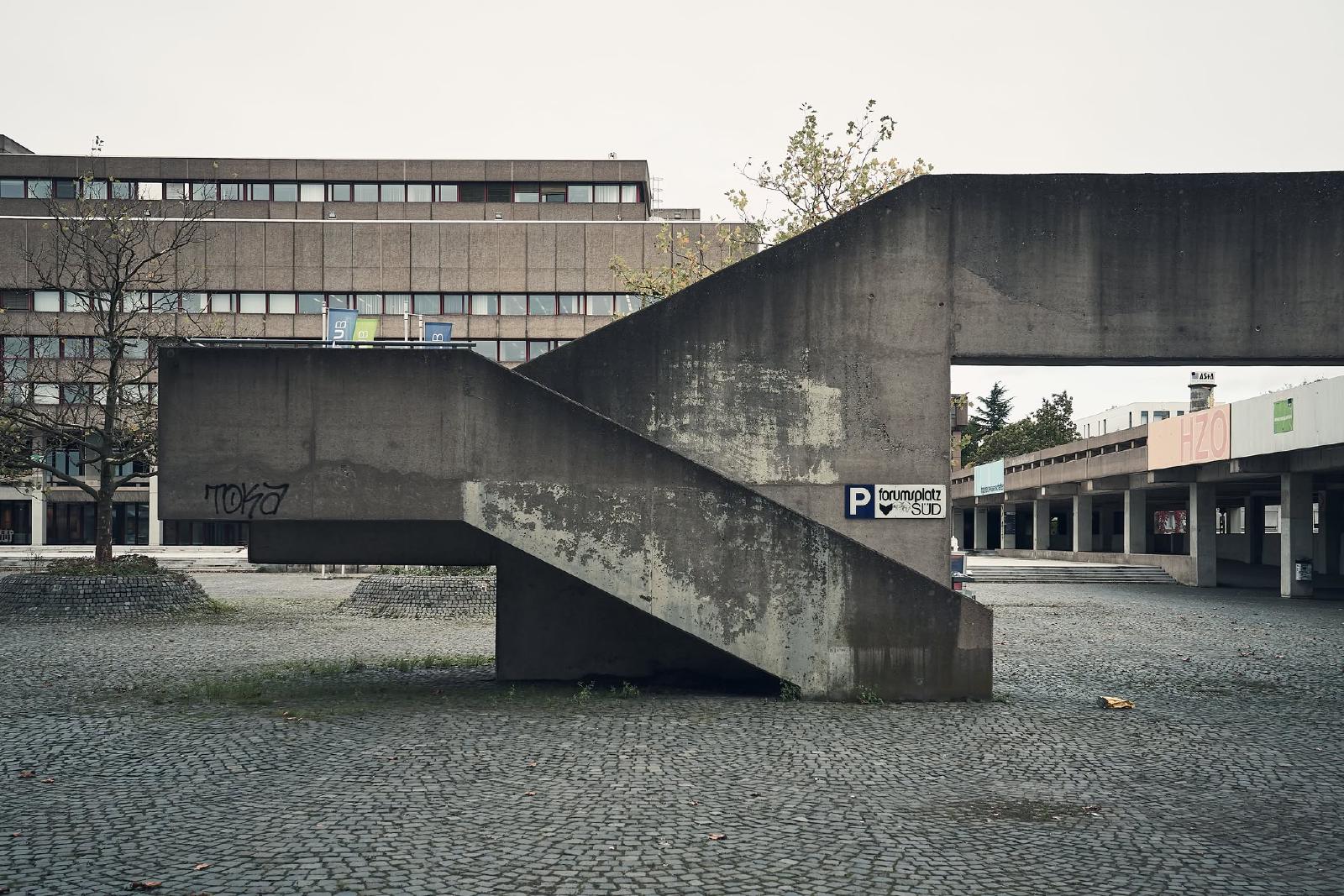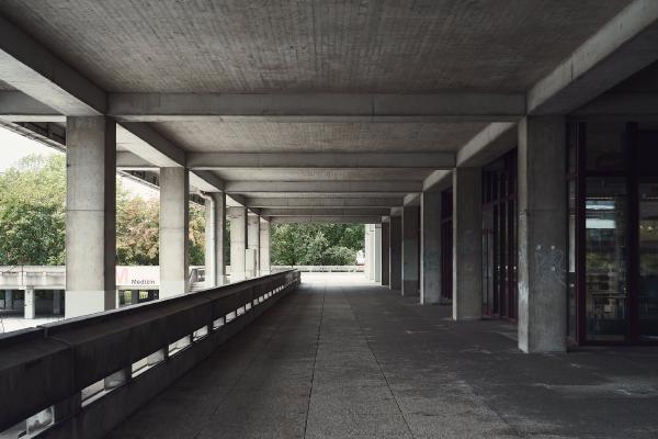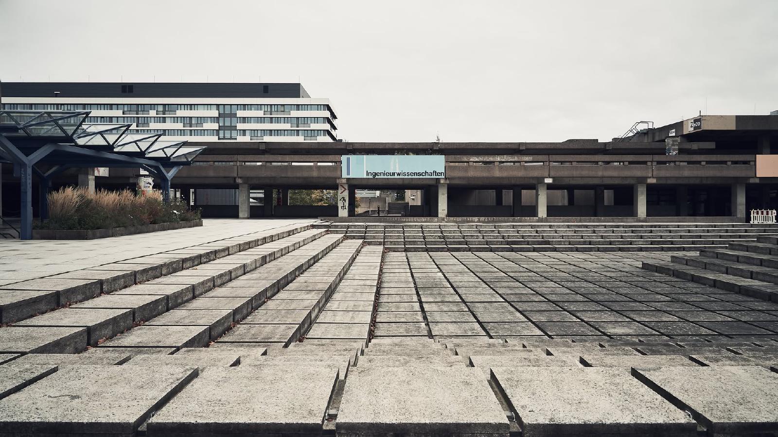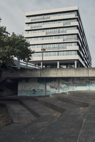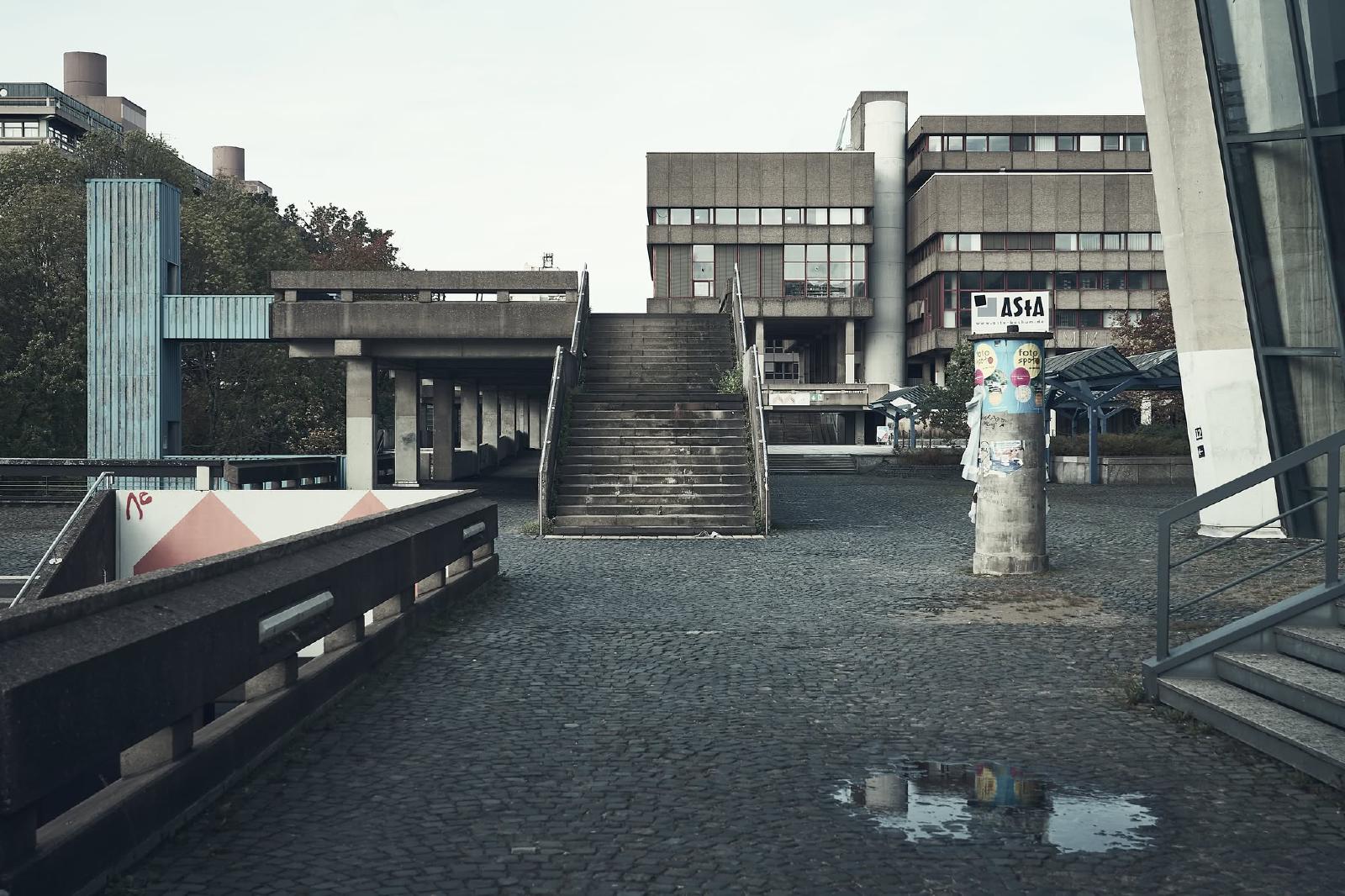 The Ruhr University Bochum was built between 1965 and 1974 and is an example of the Brutalist style in architecture. The term brutalism does not refer to the word brutal, but to “béton brut”, the French term for exposed concrete.